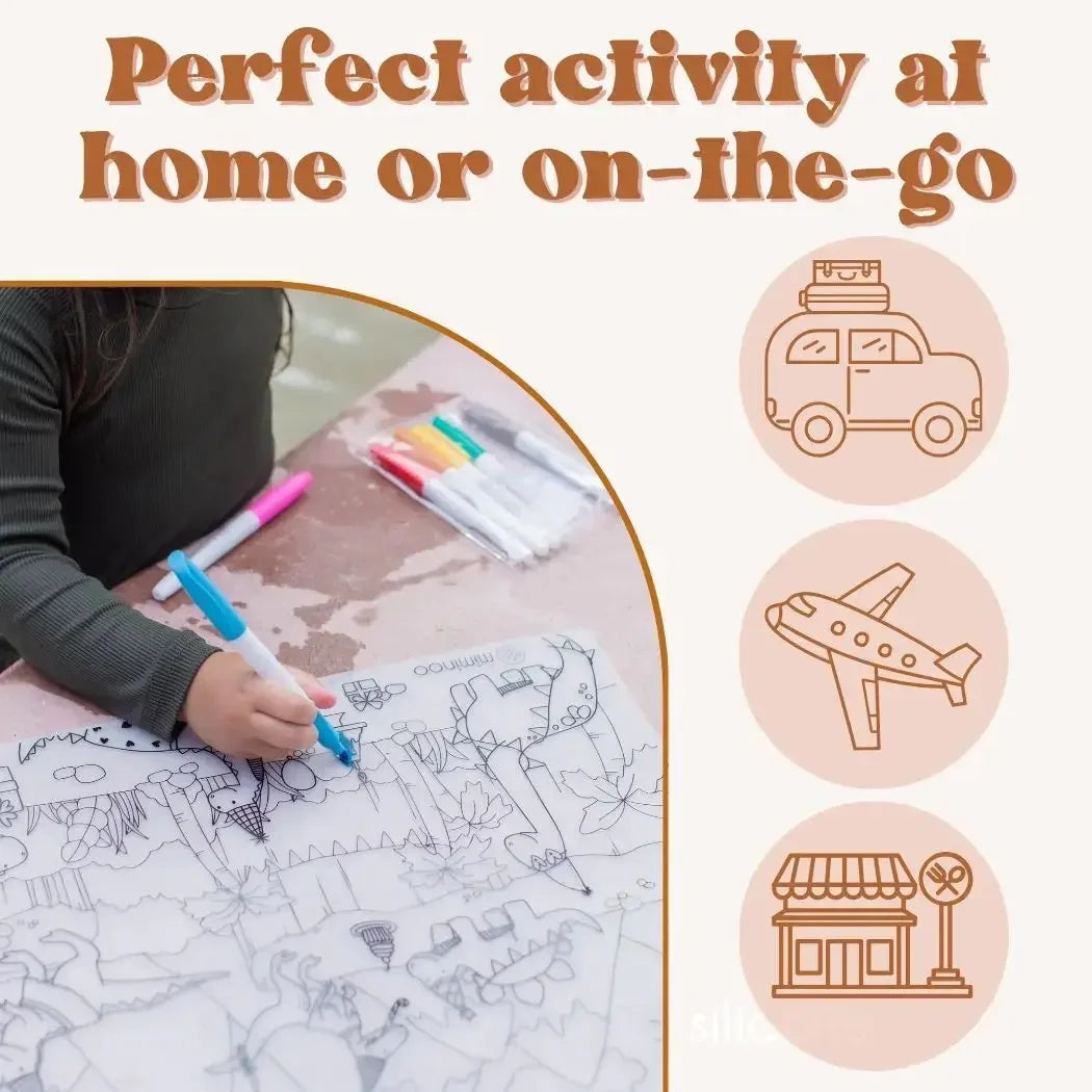 The Miminoo coloring mat offers endless coloring fun for your child in an eco-friendly way! Say goodbye to paper - Use our non-toxic dry erase markers on its soft, erasable & germ-free silicone material to color, wipe clean, and color again!